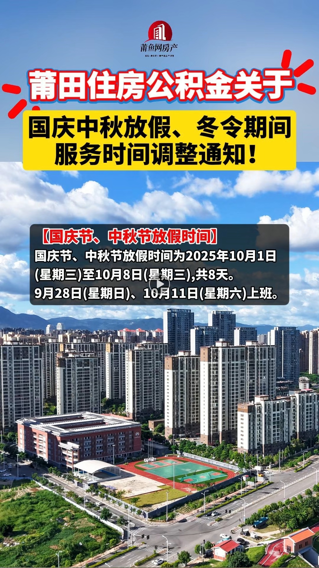 最新!莆田住房公积金关于国庆中秋放假和冬令期间对外服务时间调整通知!