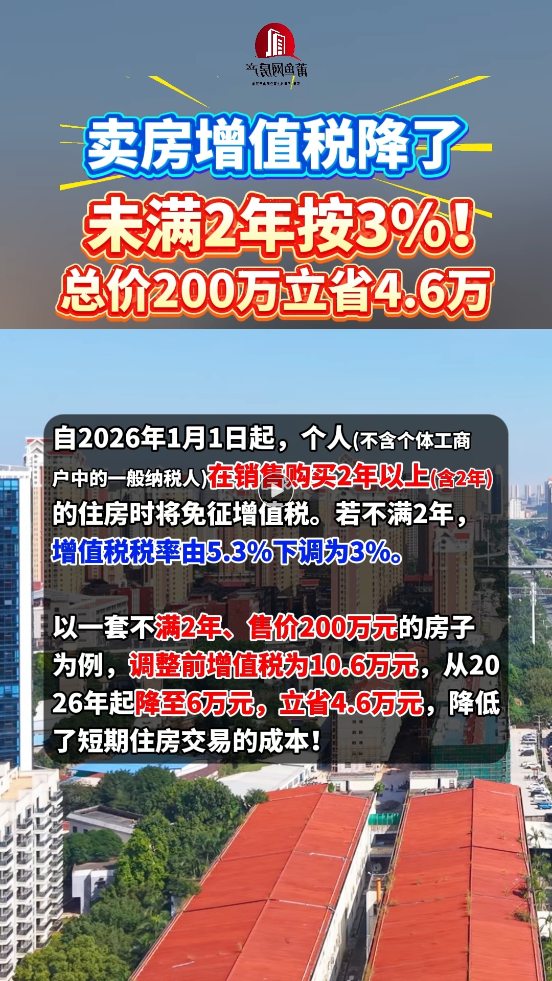 卖房增值税降了!未满2年按3%,总价200万立省4.6万!